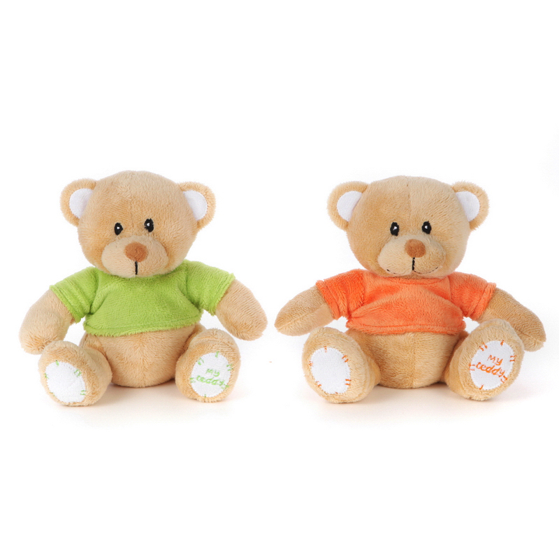 Soft, cute, adorable, huggable, cuddly and premium quality plush teddy.These come in an assortment of 3 colors for T-shirt:light green,orange,light pink.Little boys and girls will love this toy for imaginary play and as a companion for car rides, going to sleep, nap time or even soothing fears of the dark.